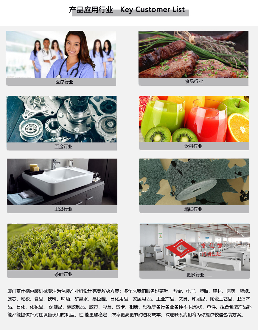 茶葉、食品、衛(wèi)浴、化妝品、 壁紙、 濾芯、保健品、五金、電子、塑膠、建材、醫(yī)藥、地板、飲料、啤酒、礦泉水、易拉罐、日化用品、家居用 品、工業(yè)產(chǎn)品、文具、印刷品、陶瓷工藝品、橡膠制品、膠帶、彩盒、賀卡、相冊、相框等各行業(yè)不同形狀、單件、組合包裝產(chǎn)品提供針對性設(shè)備機型,也可根據(jù)客戶實際情況進行定制開發(fā)。富仕德包裝機械:性能穩(wěn)定,效率、速度更高、節(jié)約包材成本、減少次品率、廠家直銷,售后無憂。歡迎來電或留言,可免費試包產(chǎn)品;我們也誠邀您隨時到公司實地考察,并免費為您規(guī)劃適合您的包裝解決方案。